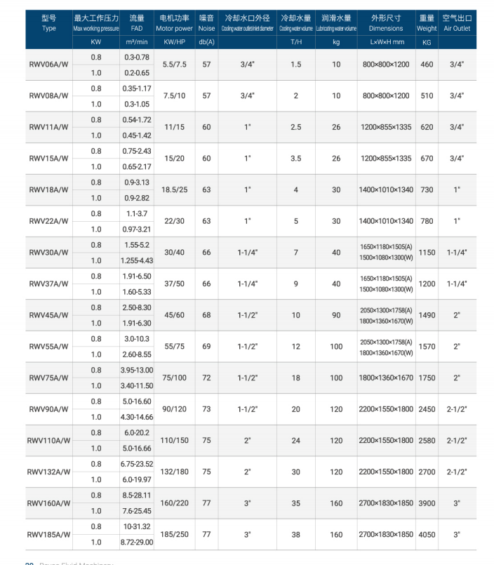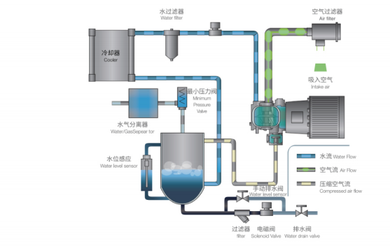 Compressed air, after being cleaned withlubricating water, becomes cleaner andcan be directly used for breathing. Thedew point of saturated compressed air islower,and the water content of com-pressed air is on average 25% lower thanthat of ordinary dry screw air compressors.